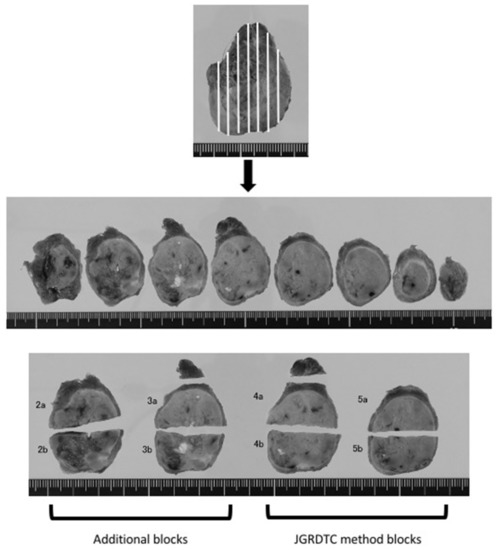 For the case shown in Figure 1, thyroid tissue was cut into eight tissue slices (Figure 1, middle), with a nodule being visible in seven of these sections. We prepared four blocks according to the JGRDTC method, comprising sections resected from the maximum cut surface (Figure 1(4a,4b)) and resected sections were selected based on gross examination (Figure 1(5a,5b)). Four additional blocks were prepared (Figure 1(2a,2b,3a,3b)) using two resected sections selected via gross examination. A tentative pathological diagnosis was made in each case, based on the JGRDTC method (the “tentative diagnosis”), and a “revised diagnosis” based on all blocks. A pathologist’s assistant, K.I., prepared the tissue blocks, and a pathologist specializing in endocrine pathology, K.K., made the pathological diagnosis. The pathological diagnosis made at the time of surgery was based on the 3rd edition of the WHO classification [2]. In this study, both the tentative and revised diagnoses were reclassified according to the 4th edition of the WHO Classification of Tumours of Endocrine Organs [3].