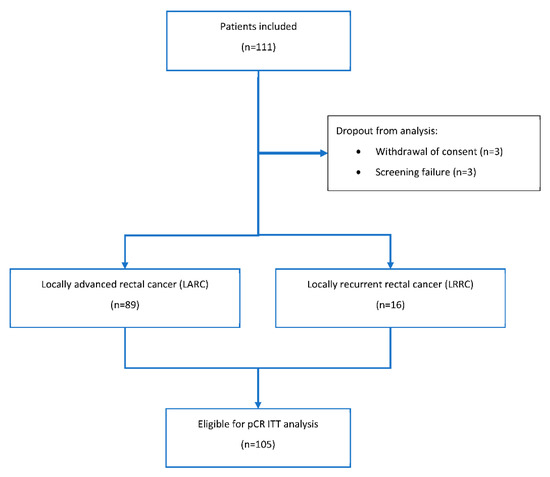 Between 2012 and 2018, 111 patients with histologically confirmed UICC stage IIB-IV adenocarcinoma of the rectum were enrolled. Six patients dropped out from primary intention-to-treat (ITT) efficacy analysis (see Figure 1). Finally, 89/105 (85%) of the patients had a locally advanced rectal cancer (LARC), and 16/105 (15%) a LRRC. All treatments described in the manuscript were carried out in accordance with national law and the Helsinki Declaration of 1975 in its current, revised form [7]. Informed consent was obtained from all patients (University of Erlangen Ethical Review Committee No. 119_12 Az).