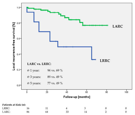 Median follow-up for all patients was 34 months (range; 0–81). Five-year overall survival was 75% for the whole group, and 82 vs. 46% for patients with LARC and LRRC. At the time of analysis, 16/105 (15%) patients were dead, 10/105 (9.5%) experienced local recurrence, and 35/105 (33%) had distant metastases. Five-year local recurrence-free and distant metastasis-free survival rates were 77 vs. 49% (see Figure 2) and 60 vs. 41%, respectively. Nine of sixteen patients (56%) died without local control and 15/16 (94%) with distant metastases, and all 16 patients died because of the tumor disease. Regarding LRRC patients only, 7/7 died without local control and 6/7 with distant metastases, and exclusively regarding LARC patients 2/9 died without local control and 9/9 with distant metastases. Disease-specific (DSS) and disease-free survival (DFS) rates differed between the subgroups at five years: 85 vs. 52% and 57 vs. 37%. Among the curatively operated patients, the rates of microscopically complete resections (R0) were 78/79 (99%) and 10/12 (80%) for the LARC and LRRC groups, respectively.