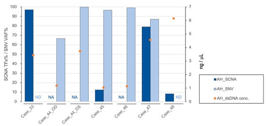 Diagnostic information from AH liquid biopsy with graph showing the tumor fraction (TFx) of SCNA (dark blue bar), variant allele frequency (VAF) of RB1 SNV (light blue bar), and cfDNA quantification (orange dots) for each case’s AH sample at time of diagnosis. NA: not available; ND: not detected.