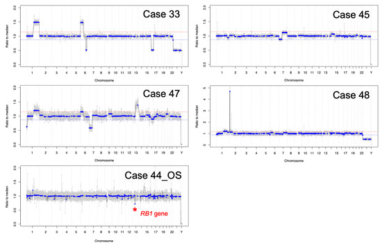 Genomic profiles for the 4 eyes with detectable large-scale SCNAs (cases 33, 45, 47, 48) and the 1 eye with a focal RB1 gene deletion (Case 44 OS).