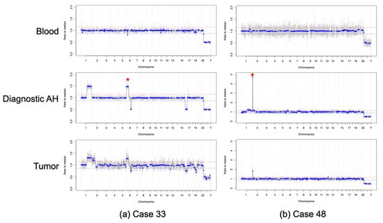 All eyes were followed longitudinally throughout therapy for at least 12 months (median follow-up 24 months, range 18–25 months). Five eyes were cured with therapy, and two required enucleation (Cases 33 and 48) as definitive management due to persistently active intraocular disease. Both of these secondarily enucleated eyes had either a 6p gain (Case 33, with an amplitude of 1.5 ratio to the median; Figure 3a) or a MYCN amplification (Case 48, with an amplitude of 4.5 ratio to the median; Figure 3b) present at diagnosis, which have been previously identified as poor prognostic factors for overall globe salvage [7,18]. For the two eyes that required enucleation, SCNA profiles obtained from tumor tissue were highly concordant—92.81% for Case 33 and 96.55% for Case 48—with those obtained from the AH at diagnosis (Figure 3). Matched blood samples were also collected at time of diagnosis. All genomic profiles generated from cfDNA in the blood plasma were flat and no SCNAs were detected (Figure 3); while the presence of ctDNA in the blood plasma could not be ruled out, it is clearly below the threshold for detection of prognostic SCNAs.