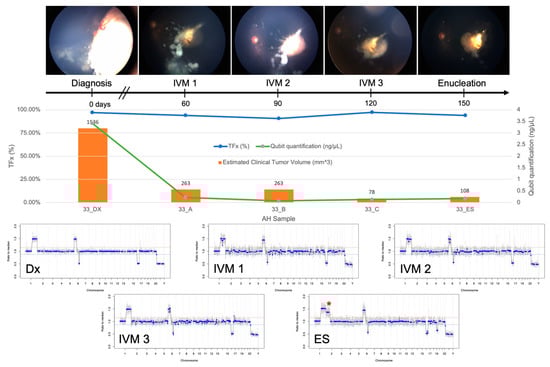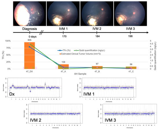 TFx has been shown to correlate with response to therapy both in eyes with RB as well as in other cancers [19,29]. In Case 33, TFx values remained high throughout IVM treatment, reflecting the persistently active vitreous seeding in addition to apical tumor recurrence that led to enucleation (Figure 4). In contrast, Case 47 was responsive to treatment, and the eye was ultimately salvaged. TFx was initially 79% and then decreased to <10% after systemic chemotherapy and throughout IVM treatment (Figure 5).