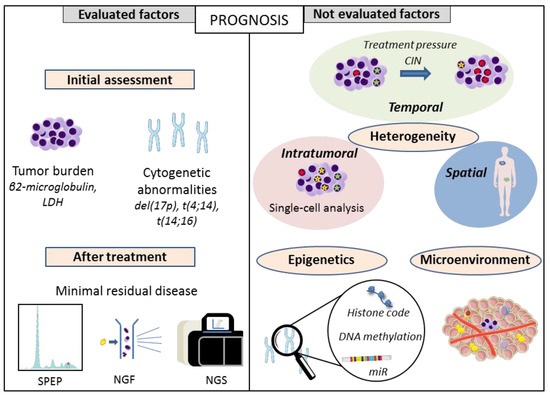 Multiple myeloma (MM) is a hematological malignancy characterized by the accumulation of tumor plasma cells (PCs) in the bone marrow (BM). Despite considerable advances in terms of treatment, patients’ prognosis is still very heterogeneous. Cytogenetics and minimal residual disease both have a major impact on prognosis. However, they do not explain all the heterogeneity seen in the outcomes. Their limitations are the result of the emergence of minor subclones missed at diagnosis, detected by sensible methods such as single-cell analysis, but also the non-exploration in the routine practice of the spatial heterogeneity between different clones according to the focal lesions. Moreover, biochemical parameters and cytogenetics do not reflect the whole complexity of MM. Gene expression is influenced by a tight collaboration between cytogenetic events and epigenetic regulation. The microenvironment also has an important impact on the development and the progression of the disease. Some of these determinants have been described as independent prognostic factors and could be used to more accurately predict patient prognosis and response to treatment.