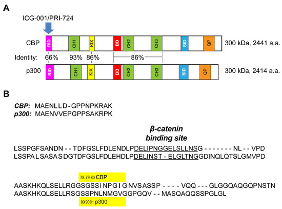 The vertebrate radiation, which was initiated approximately 450 million years ago, ushered in a major lifestyle change with a significant increase in adult lifespan [1,2] and with it, a requirement for high-fidelity, long-term homeostasis [2]. This change necessitated that somatic stem cells (SSC), in their respective niches, remain quiescent, in contrast to their differentiated daughter cells, which rapidly proliferate, in order to safeguard the integrity of the SSC’s genetic material [1,3]. The gene duplication of the Kat3 coactivator family, which led to the evolution of Kat3A/CREBBP (cAMP response element binding protein (CREB)-binding protein) (CBP) and its closely related paralog Kat3B/E1A-binding protein, 300 kDa (p300), apparently occurred just prior to radiation of the vertebrate lineage [1]. The two Kat3 coactivators encode massive proteins of ~300 kDa over 33 and 31 exons, respectively [1]. CBP and p300 have maintained an extraordinarily high degree of identity—as high as 93%—and an even higher degree of similarity, particularly over an extensive central core region, which encompasses the CH1, KIX, bromodomain, CH2 and CH3 domains (Figure 1A) [1,2,4,5]. They both interact with a myriad of proteins, given their key roles in orchestrating transcription [1]. Due to their high degree of identity and even greater similarity at the amino acid level, CBP and p300 have long been considered redundant. However, mounting evidence clearly demonstrates that they are non-redundant, playing definite and distinctive roles in development and disease [1,6,7,8,9,10]. β-catenin, a key transcriptional component in Wnt signaling, must recruit CBP or p300 in addition to other components of the core transcriptional complex to initiate functional Wnt transcription [1,11,12]. The extreme N-terminal regions of CBP and p300, containing the lowest homology with approximately 66% identity, have been the focus of our interest. β-catenin and specific, direct small molecule CBP/catenin antagonists (ICG-001/PRI-724) [1,9,13,14] and direct small molecule p300/catenin antagonists (YH249/250) [15], competitively bind within this extreme N-terminal region (Figure 1A) [1]. This highly unstructured region of the Kat3 coactivators serves as a nexus for integrating the interactions of varied signal transduction pathways (e.g., nuclear receptor family, RAR/RXR, vitamin D, and Interferon STAT1/2) with the Wnt/catenin signaling cascade [1,9,16,17,18,19]. We originally identified p300 serine 89 as a critical residue (Figure 1B) controlling differential coactivator usage by β-catenin via post-translational phosphorylation in mouse embryonic stem cells [20]. p300 serine 89 appears to be a target for a number of kinase cascades including PKC [21,22], AMPK [23], and SIK2 [24], associated with an array of biological effects, including activation and inhibition of transcription [23,25], inhibition of histone acetyltransferase function [22], regulation of insulin/glucagon signaling [24], and differentiation of mES cells [20] and adult progenitor cells [26].