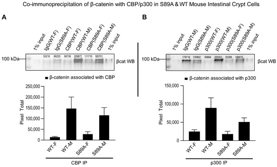 p300 S89A mice show differential usage of Kat3 coactivators CBP and p300 by β-catenin. Co-immunoprecipitation of β-catenin with CBP (A) or p300 (B) in S89A and WT mouse intestinal crypt cells. Control (IgG) antibody and anti-CBP antibody or anti-p300 antibody were used for immunoprecipitation followed by immunoblotting for β-catenin. Numerical values above protein bands indicate densitometric quantitation of β-catenin associated with CBP or p300. Bar graphs show densitometric quantitation normalized to respective control. Data in bar graphs (mean ± s.e.m.) representative of three independent experiments are shown. S89A, p300 S89A; WT, wild type; F, female; M, male; βcat, β-catenin; IP, immunoprecipitation. Whole immunoblots corresponding to immunoblot data are included in Figure S3.
