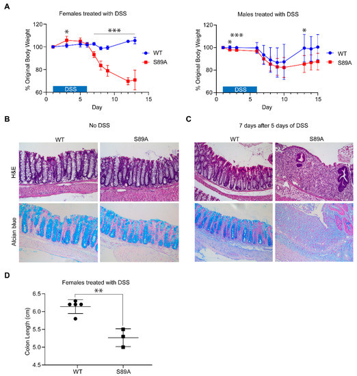 Prior to DSS treatment, the colonic epithelium of S89A mice was normal, essentially the same as WT mice. Prior to treatment, in both S89A and WT mice, crypt architecture was intact and there was no evidence of neutrophil mediated epithelial injury or histological features suggestive of ongoing chronic mucosal injury. Alcian blue staining demonstrated the presence of intact goblet cells (Figure 3B). Histological examination of control and mutant mouse colons at day 12 after DSS treatment (five days treatment, seven days off) showed that S89A mice were nearly devoid of normal colonic epithelium. Hematoxylin and eosin staining showed colonic mucosa with lamina propria replacement by granulated tissue and fibrinopurulent exudate, consistent with ulceration. The few remaining crypts exhibited architectural distortion, indicative of chronic mucosal injury. Alcian blue staining highlighted mucin loss and decreased goblet cells consistent with epithelial injury (Figure 3C), whereas the tissue from WT mice was normal. The colon length of S89A female mice compared to WT controls, one week after 5 days of DSS administration, was somewhat shorter (5.3 versus 6.1 cm) (Figure 3D).