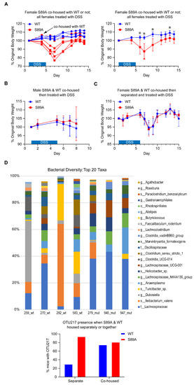 Perturbations of host–microbiota homeostasis induced by the host genetics and/or environmental factors can fuel inflammation at mucosal surfaces [37,38]. S89A mice were initially housed separately from control mice. We therefore decided to examine whether cohousing and thereby intermixing of the microbiota of S89A and WT mice would affect sensitivity to DSS induced colitis. Although separately housed S89A mice were dramatically more sensitive to 2% DSS treatment (Figure 4A), S89A mice were protected against the effects of the 2% DSS treatment when co-housed with WT mice (Figure 4A, left panel and Figure 4B). Interestingly, if mice subsequently were separated again for four weeks after four weeks of co-housing, both WT and S89A mice had intermediate sensitivity to DSS treatment (Figure 4C). 16S rRNA gene sequencing of stool samples from the separately housed WT and S89A mice demonstrated large taxonomic differences in the microbiota as depicted in a barplot of the top ~20 taxa in each sample (Figure 4D, upper panel). The Shannon (alpha) diversity of the two groups was not significantly different, indicating that the communities had about the same evenness and similar numbers of organisms and similar distribution. On the other hand, the Bray–Curtis and Jaccard (beta) diversity (Figures S5 and S6) was different between the two groups, indicating that the two groups were significantly different in their composition (that is members of the communities). Interestingly, at least one particular bacterial species, OTU-217, which we identified as Kineothrix alysoides and was present in S89A mice yet absent or at very low levels in WT mice housed separately, was transferred effectively during cohousing, and may contribute to enhancing the sensitivity of WT mice to DSS induced colitis (Figure 4D, lower panel).