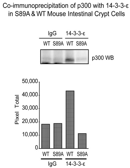 The 14-3-3 protein family of scaffolding chaperones regulates diverse intracellular signaling pathways [58]. We observed that the p300 sequence LLRSGSSP (aa 84–91) is a member of the consensus 14-3-3 binding site sequence (LX(R/K)SX(pS/pT)XP) [59]. It is unique to p300 and not conserved in CBP. We therefore anticipated that mutation of serine 89 to alanine would disrupt the binding of 14-3-3 proteins to p300. Immunoprecipitation of 14-3-3 epsilon (14-3-3ε) was performed using protein from intestines of WT and S89A mice and subsequently immunoblotted with an antibody specific for p300. As shown (Figure 7) a substantial decrease in the association of 14-3-3ε with p300 was demonstrated in intestinal tissue from S89A mutant mice. To confirm these findings, we carried out the reverse experiment, i.e., anti-p300 antibody was used for immunoprecipitation followed by immunoblotting for 14-3-3ε. Again, we found a substantial decrease in the association of 14-3-3ε with p300 in S89A mutant mouse intestinal tissue (Figure S7). Further studies are needed to address the importance of this interaction, however differential subcellular localization of p300 regulated by its interaction with 14-3-3 proteins could potentially affect its role as a nuclear transcriptional coactivator.