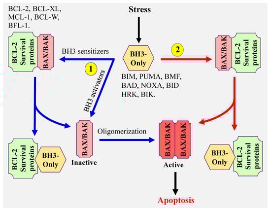 One of the main steps of tumor initiation and progression is the evasion of apoptosis [1]. While cancer cells are fully equipped with apoptosis machinery, they develop various strategies to block the apoptosis process. Induction of apoptosis occurs through two main pathways: the intrinsic pathway generally activated by cellular stress (metabolism, oncogenes, DNA damage, nutrient deprivation, etc.) and the extrinsic pathway activated by death receptors (Tumor Necrosis Factors, Trail, Fas, etc.) [2]. Induction of these separated, but interconnected pathways, leads to activation of caspases, a class of cysteine proteases, which orchestrates the cleavage of vital cellular components leading to cellular death [3]. In the intrinsic pathway of apoptosis, caspases activation requires mitochondrial outer membrane permeabilization (MOMP), an event that leads to the release of cytochrome c from the mitochondrial intermembrane space into the cytosol [4]. These steps are tightly regulated by the BCL-2 family of proteins, which includes anti-apoptotic and pro-apoptotic proteins. The former includes BCL-2, BCL-XL, MCL-1, BCL-W, and BFL-1 also known as A1, whereas the latter includes effector proteins BAK, BAX, and BOK; and BH3 only proteins, which are grouped into sensitizers: BAD, NOXA, BMF, HRK, BIK; and activators: BIM, BID, and PUMA [5,6]. It is important to note that increasing evidence indicates that other BH-3 only proteins (e.g., NOXA) have the capacity to directly activate BAX and BAK, resulting in a less clear distinction between BH3-only sensitizer and activator proteins [7]. The ultimate decision whether a cell should live or die is controlled not only by the protein levels of the pro- and anti-apoptotic members, but also by the interplay between these two groups of proteins. In live cells, the proapoptotic BCL-2 proteins are largely sequestered by the anti-apoptotic members (BCL-2, BCL-XL, MCL-1, BCL-W, and BFL-1). However, under apoptotic insults, the BH3-only proteins play a central role in initiating apoptosis.