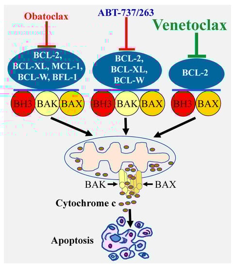Specificity of various types of BCl-2 inhibitors and induction of apoptosis. Targeting the Bcl-2 pro-survival proteins by various inhibitors with different specificity (ABT-737/ABT-263, obatoclax, or venetoclax) leads to BAX/BAK activation and pores formation through which cytochrome c is released into the cytosol culminating in apoptosis induction.