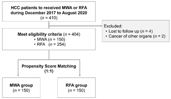 We defined high-risk HCC nodule locations as being adjacent to large vessels or extrahepatic organs, based on a previous report by Teratani et al. [23]. These locations were considered to be located <5 mm from a first or second branch of the portal vein, the base of the hepatic veins, the inferior vena cava, the heart, the lungs, the gallbladder, the right kidney, or the intestinal tract. In total, 405 patients were considered eligible, including 150 patients who underwent MWA and 255 patients who underwent RFA. We used PSM (1:1 ratio) to create two groups of matched patients (n = 150 each) who underwent MWA or RFA.