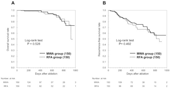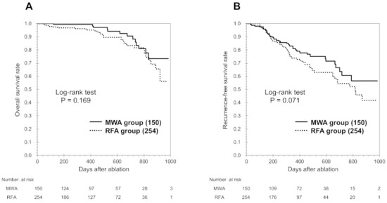 Kaplan-Meier curves for overall survival (OS, A) and recurrence-free survival (RFS, B) among all patients. No significant differences were observed between the groups that underwent microwave ablation (MWA) and radiofrequency ablation (RFA).