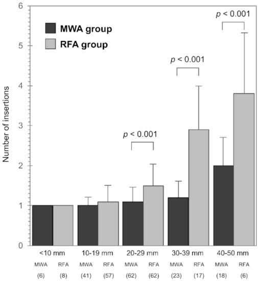 Total number of insertions according to tumor size. There was no significant difference in the total number of insertions for tumors that were sized <19 mm, although significantly fewer insertions were required for tumor sizes of >20 mm in the MWA group (p < 0.001). MWA, microwave ablation; RFA, radiofrequency ablation.