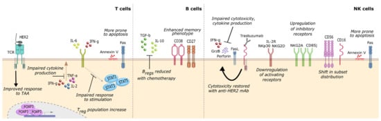 Figure 1. Surface markers and cytokine response of lymphoid peripheral immune cell populations associated with breast cancer occurrence and/or progression. In the lymphoid lineage, T cells and NK cells acquire a stronger suppressive phenotype in breast cancer patients including diminished response to, and production of, pro-inflammatory cytokines, higher susceptibility to apoptosis and impaired cytotoxic response—although the latter may be reversed upon exposure to tumor-associated antigens (T cells, via binding of HER2 to the TCR) or anti-HER2 therapeutic antibodies (NK cells, via binding of trastuzumab to CD16). B cells were also found to respond to chemotherapy regimens by reducing the Breg population, thus promoting anti-tumor immune function. NK, natural killer cells; TAA, tumor-associated antigen; TCR, T cell receptor.