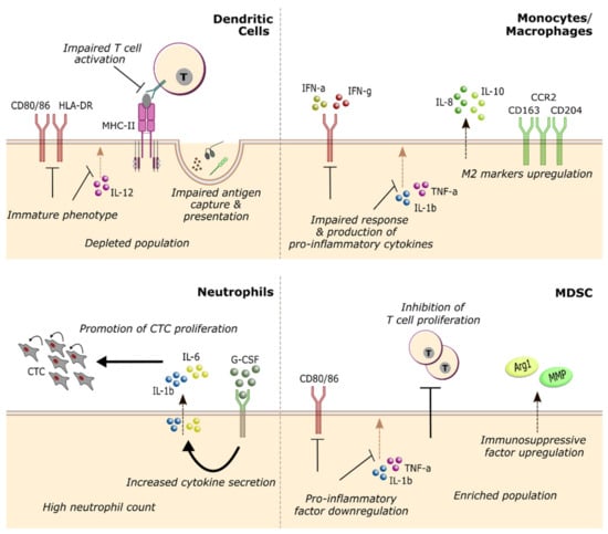 Figure 2. Surface markers and cytokine response of myeloid peripheral immune cell populations associated with breast cancer occurrence and/or progression. In the myeloid lineage, breast cancer patients display a marked increase in cell populations with pro-tumorigenic functions (like MDSC and neutrophils), while anti-tumorigenic populations of dendritic cells are depleted and the remaining dendritic cells (DC) acquire an immature phenotype, preventing the mounting of effective immune responses. Monocyte and macrophage function is also skewed towards immune suppression, with impaired response to pro-inflammatory stimuli and upregulation of M2 markers. CTC, circulating tumor cell; MDSC, myeloid-derived suppressor cell.