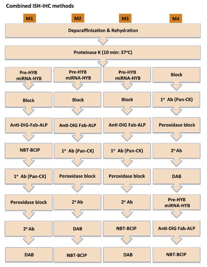 ISH of miR and IHC of pan-CK were performed on the same tissue section following the methods described above, and in different order sequences as illustrated in the flowchart (Figure 1).
