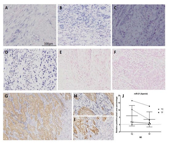 Figure 2. Representative images of ISH for various miRs: single ISH for miR-21 (A), miR-155 (B), and miR-204 (C); U6—positive control (D), scramble oligonucleotide with no target site—negative control (E), negative control without miR-binding probe (F), double ISH-IHC for miR-21 and pan-CK using method 3 (G) showing intense staining at tumor center (H) and weaker staining at tumor front (I) as quantified using AperioI in (J). Original magnification: 10×; scale bar: 100 µm.