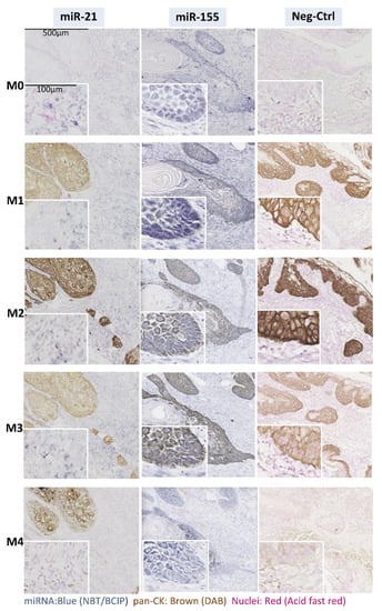 Figure 3. Representative images for combined miR ISH (miR-21 and miR-155) and IHC (pan-CK). Serial sections of the tissue were stained for miR alone (M0.ISH) or miRs ISH was combined with IHC of pan-CK (M1.ISH+IHC; M2.ISH-Fab+IHC+NBT-BCIP; M3.ISH-Fab+1oAb-2oAb+NBT-BCIP+DAB. M4. IHC+ISH). Scramble negative control or no probe control (Neg-Ctrl) was run for miR-21 and miR-155, respectively. Since no differences were observed, only scramble negative controls are presented. Original magnification: 5×; scale bar: 500 µm. Inset: original magnification: 20×; scale bar: 100 µm.