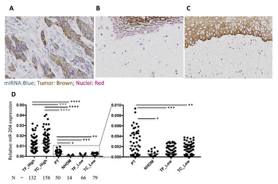 Figure 4. Representative images from a double stained section for miR-204 and pan-CK in tumor (A), peritumor (B), and normal mucosa (C) in OSCC. Original magnification: 20×; scale bar: 100 µm. (D) Wilcoxon test for the paired variables (tumor front (TF), tumor centre (TC), and peritumor (PT)). Mann–Whitney U test for all other comparisons (independent). **** p < 0.0001; *** p < 0.0005; ** p < 0.001; * = p < 0.05.