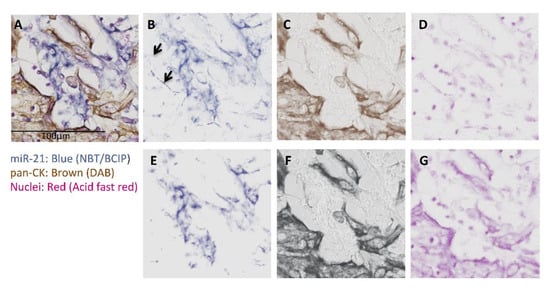 Figure 5. Color deconvolution of a representative image from a double stained section for miR-21 and pan-CK. (A) OSCC (oral squamous cell carcinoma) section stained for miR-21 (blue; NBT-BCIP), pan-CK (brown; DAB) and counter stained (red; acid fast red). Image A was color deconvoluted into individual color images: (B) (NBT-BCIP), (C) (DAB), and (D) (acid fast red). Color deconvolution using RGB vectors for black color instead for DAB (brown) for the same image took away non-NBT-BCIP signals ((E); indicated by arrows in (B), while overexposing brown (F) and red (G). Original magnification: 20×; scale bar: 100 µm. Vectors used: Nuclear fast red (NFR)-NBT-BCIP-DAB (NFR: R=0.350, G = 0.840, B = 0.408; NBT-BCIP: R = 0.677, G = 0.627, B = 0.384; DAB: R = 0.443, G = 0.598, B = 0.667), and NFR-NBT-BCIP-BLACK (NFR: R = 0.375, G = 0.827, B = 0.416; NBT-BCIP: R = 0.647, G = 0.649, B = 0.398; BLACK: R = 0.588, G = 0.578, B = 0.565).