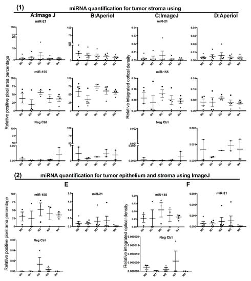 Figure 6. Graphs depicting quantification of miRs (miR-21 and miR-155) detected by different methods and using two different software. Means of positive pixel area percentage (PPAP, 1A and 1B) and integrated optical density (IOD, 1C and 1D) of miR signal in single ISH (control method: M0) and various combinations of double staining methods (M1-M4) were compared using paired Student´s t-test. No miR probe served as negative control tissue (Neg Ctrl). Two different types of image analysis software were used for the quantification: ImageJ (1A,1C,2E,2F) and Aperio (1B and 1D). In 2E and 2F, measurements include both tumor and stroma. Same symbols in the graphs indicate same tissue.