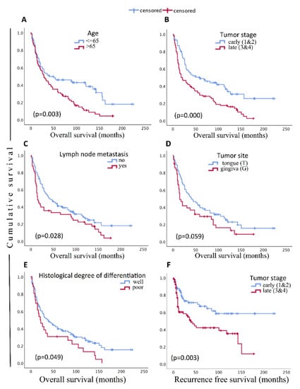 Tests of associations in between clinicopathological parameters (Pearson’s Chi-square: Phi and Cramer’s V test ) showed significant association of WPI type 4 (p = 0.042), high tumor budding (p = 0.051), and late tumor stage group (3 and 4) (p = 0.027) with higher recurrence. Higher tumor budding (p = 0.019) and late tumor stage (p = 0.000) were associated with increased risk of lymph node metastasis. Localization of tumor in gingiva (p = 0.001) compared to tongue, and poor histological degree of differentiation (p = 0.007) were associated with late tumor stages. Tumor budding showed significant association with WPI (p = 0.001) and histological degree of differentiation (p = 0.004). Significant association between tumor stage and depth of invasion (p = 0.000), alcohol and gender (p = 0.005), smoking and gender (p = 0.001), smoking and alcohol (p = 0.000), age and gender (p = 0.001, higher proportion of males were in the age group >65), age and tumor site (p = 0.031), and age and smoking (p = 0.001, lower proportion of smokers in age group >65) were also observed. KM survival analysis of the clinicopathological parameters demonstrated significantly lower OS for lymph node metastasis and late tumor stage groups (Figure 7). For age groups, age group greater than 65 showed poorer OS compared to the younger group. OS was poorer with poorer histological degree of differentiation and when the site of tumor was the gingiva (Figure 7). Subsequent univariate Cox regression of the clinicopathological variables showed significant increase in relative risk of death for age group >65 years, late stage tumor, and lymph node metastasis. Tumor site in gingiva and poor histological degree of differentiation also showed significant increase in OS risk (Table 1). Multivariate Cox regression of the significant parameters in the univariate model revealed age and tumor stage as the independent predictors of the OS (Table 2). Only tumor stage showed significant association with RFS in the univariate analysis (Table 1). Late tumor stages approximately doubled the risk of recurrence compared to early tumor stages (Table 2).