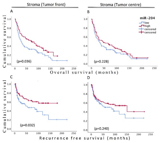 Figure 8. Kaplan–Meir survival plots (overall survival and recurrence-free survival) for low and high miR-204 expression groups in the stroma at the tumor front (A,C) and tumor center (B,D). p values are derived from log-rank test.