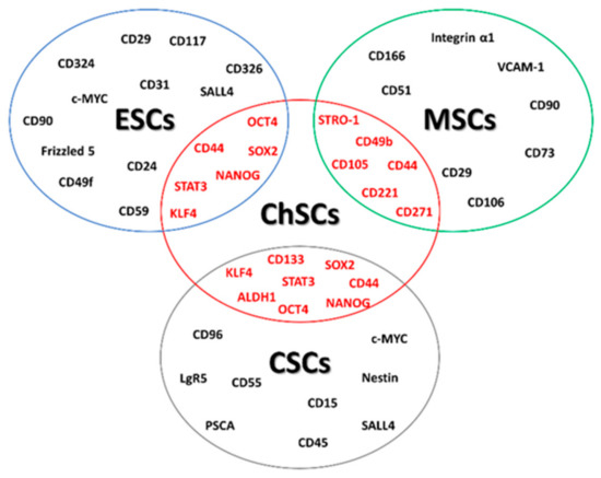 Consequently, the treatment targeting SSCs inducing cell differentiation or programmed cell death of this subpopulation is recognized as a promising and encouraging approach [27,28]. A rapidly growing number of data suggest that ChS may originate from transformed MSCs localized in the bone marrow [29,30,31,32]. Stem cells in ChS share some characteristics with MSCs, embryonic stem cells (ESCs), and CSCs (Figure 1).