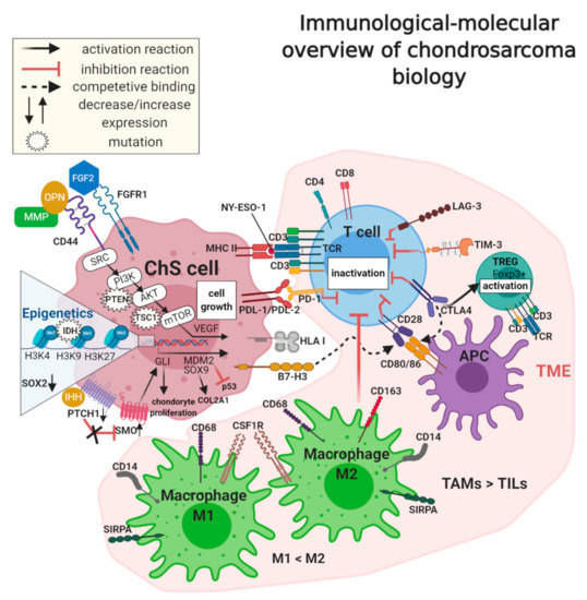 Immunological-molecular overview of chondrosarcoma (ChS) biology. Immune cell markers (PDL-1/2, B7-H3, and MHC), mesenchymal stem cell markers (CD44), and the tumor microenvironment (TME), in which the primary role is played by tumor-infiltrating lymphocytes (TILs) and tumor-associated macrophages (TAMs), especially the M2 type, participate in ChS pathogenesis and immunosuppression. Other important factors involved in ChS progression are deregulations in molecular pathways (PI3K/AKT/mTOR and hedgehog), epigenetic modifications (trimethylation of H3K4, H3K9, H3K27), and gene mutations (PTEN, TSC1, IDH), which together characterize the tumor.
