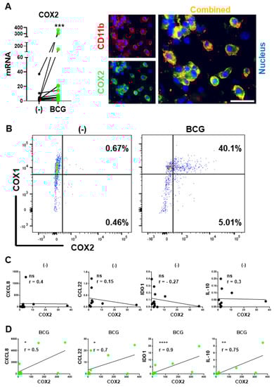 BCG induces COX2 expression: BCG-induced but not baseline COX2 levels correlate with intratumoral expression of immunosuppressive factors in BlCa microenvironments. (A), Left: BCG enhances COX2 mRNA expression in ex vivo treated tumor tissues from BlCa patients (n = 13). Each pair of symbols and connecting line represents a single patient (mean mRNA expression in triplicate cultures per condition, relative to HPRT1). Right: CD11b+ myeloid cells are the major source of COX2 in BCG-treated BlCa TME. Tumor explants were treated for 24 h and evaluated by fluorescence microscopy. (B), Representative flow cytometry data from untreated and 24-h BCG-treated macrophage cultures from a single donor. (C), Lack of correlations between COX2 and Treg/MDSC attractants (CCL22, CXCL8) or suppressive factors (IDO1, IL-10) in untreated BlCa tissues. (D), Significant correlations between COX2 and CCL22, CXCL8, IDO1, and IL-10 expression in the BCG-treated BlCa explants. (C,D): Data are shown as ratios of the specific genes’ relative to HPRT1 expression determined in triplicate cultures of tumor tissues of 12 different BlCa patients (n = 12). Spearman r correlation is used for data evaluation. **** p < 0.0001; *** p < 0.001; ** p < 0.01; * p < 0.05.