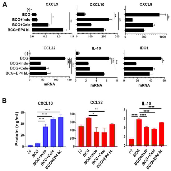 Combining BCG with the blockers of PGE2 synthesis or PGE2 signaling selectively enhances the desirable inflammatory factors in human macrophage cultures. (A), Combining BCG with indomethacin (Indo; COX1 and COX2 blocker), celecoxib (Cele; selective COX2 blocker) or ARY-007 (selective EP4 receptor blocker) enhances the induction of CTLs attractants; CXCL9 and CXCL10; but downregulates suppressive mediators; IDO1, IL-10, and MDSCs/Tregs-attractant; CXCL8 and CCL22. mRNA expression levels are normalized against HPRT1. (B), the combination therapy increases the secretion of CXCL10, but reduces CCL22 and IL-10 secretion by human macrophages. Data are shown as mean ± SEM. Wilcoxon rank test was used for statistical analysis. Results are representing the readings from human-grown macrophage culture from 3 different donors (n = 3). All cultures were performed in at least a triplicate per donor. **** p < 0.0001; *** p < 0.001; ** p < 0.01; * p < 0.05.