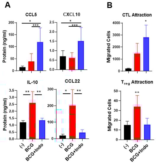 To evaluate the functional relevance of these observations, we compared the impact of BCG versus BCG plus indomethacin on the ability of the differentially treated BlCa tumors to attract the above subsets of immune cells. Although BCG consistently upregulated the gene expression of several CTL-attracting chemokines (Figure 1A), BCG alone did not induce a consistent secretion of CCL5 or CXCL10; however, it significantly enhanced CCL22 and IL-10 secretion (Figure 5A). In sharp contrast, the combination of BCG with indomethacin resulted in selective elevation of CCL5 and CXCL10 secretion, compared to untreated or BCG-treated tumors and significantly downregulated the release of the Treg-attractant CCL22 and the suppressive cytokine IL-10 (Figure 5A).