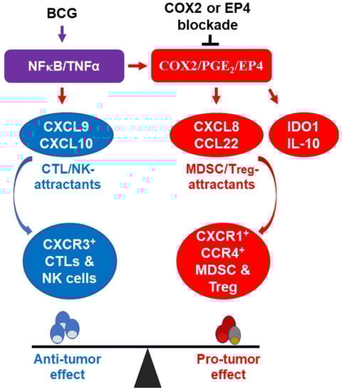 Tumor-infiltrating immune cells involve immunostimulatory and suppressive populations, with respective antitumor and tumor-promoting functions [20]. Infiltrating CD8+ cytotoxic T cells (CTLs) predict improved survival in bladder cancer and other tumors [21,22,23]. In addition, intratumoral CTLs are critically important for the clinical activity of immune checkpoint inhibition (ICI) blockers, such as PD-1, PD-L1, or CTLA-4 blocking antibodies [24,25,26]. In contrast, the preferential accumulation of regulatory T cells (Tregs) and myeloid-derived suppressor cells (MDSCs) predicts poor survival [27,28]. CTLs and suppressive cells are attracted to tumor tissues by different chemokines: Th1/NKs/CTLs-attracting chemokines include CCL5 (regulated upon activation, normal T cell expressed, and secreted; RANTES), CXCL9 (monokine induced by gamma interferon; MIG) and CXCL10 (Interferon gamma-induced protein 10; IP10), while neutrophils, MDSCs, and Tregs are attracted by, respectively, CXCL8 (interleukin 8; IL-8), CXCL12 (stromal-derived factor-1; SDF1) and CCL22 (myeloid-derived chemokine; MDC) [29,30,31,32]. Our own studies demonstrated that the balance between the production of CTL- versus Treg/MDSC attracting chemokines induced by poly-IC in colon and ovarian cancer tissues is affected by the key ubiquitous regulator and inflammatory mediator, PGE2 and the key enzyme controlling its production, COX2 [33,34]. This raises the possibility that the levels of PGE2 production and/or signaling at baseline or in response to BCG exposure may affect the balance between tumor-promoting and anti-tumor subsets of effector cells in the TME.