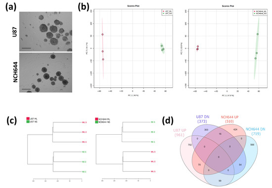 For NS formation of NCH644 cell line, cells were plated in hydrophobic surface T75 flasks (Sarstedt, Nümbrecht, Germany) with DMEM F12 (Life technologies 21331046, Carlsbad, CA, USA) supplemented with 2 mM glutamine (Sigma-Aldrich 59202C, St. Louis, MO, USA), 1% penicillin/streptomycin (Sigma-Aldrich 4333, St. Louis, MO, USA), 20 ng/mL bFGF (Biomol 50,361.50, Hamburg, Germany), 20 ng/mL EGF (Invitrogen PHG0311, Carlsbad, CA, USA) and 2% BIT Admixture (Pelo Biotech PB-SH-033-0000, Planegg/Martinsried, Germany) and maintained in a cell incubator at 37°C, 5% CO2 and a relative humidity of 95%. Specific culture conditions used for transcriptomics and metabolomics are described in Section 4.4 and Section 4.6, respectively.