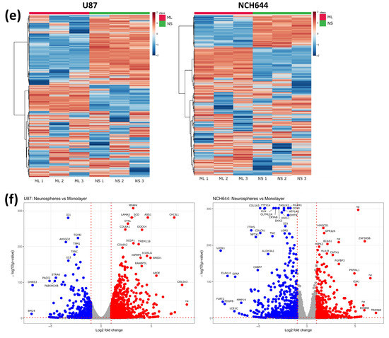 To identify changes in gene expression in GBM cells exposed to different culture conditions that promote either a stem-like or differentiated phenotype, U87 and NCH644 cells were exposed to neurosphere (NS) and monolayer (ML) culture conditions (Figure 1a) and total RNA was prepared. Transcriptomics analysis by RNA sequencing identified a total of 18,457 genes being expressed across all conditions. Principal component analysis (PCA) revealed a global transcriptomic rewiring between ML and NS in both cell lines (Figure 1b), as PC1 accounted for 46% of all variability in U87 cells and nearly 48% in NCH644 cells. The same is also apparent from the hierarchical clustering (Figure 1c), suggesting that cells exposed to the different culture conditions clearly diverge in their gene expression profile. In total, 1334 differentially expressed genes were identified in U87 cells and 1229 genes in NCH644 cells with a false discovery rate (FDR) < 0.05 and a log2FC > ±1 (Table S1a,b). The comparison between NS and ML in U87 and NCH644 presented 961 and 510 upregulated genes and 373 and 719 downregulated genes, respectively (Figure 1d). From these, 124 genes were commonly regulated by both U87 and NCH644 cells: 70 commonly upregulated genes and 54 commonly downregulated genes in NS over ML cells (Figure 1d). Moreover, 115 genes were differentially expressed in NS of the two cell lines: 16 genes were upregulated in NCH644 and downregulated in U87 cells, while 99 genes were upregulated in U87 and downregulated in NCH644 cells (Figure 1d). Corresponding heat maps and volcano plots are also shown (Figure 1e,f).