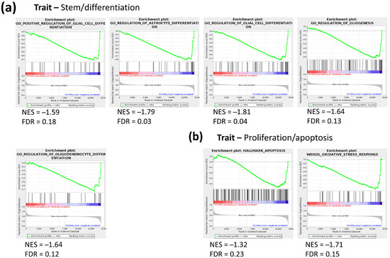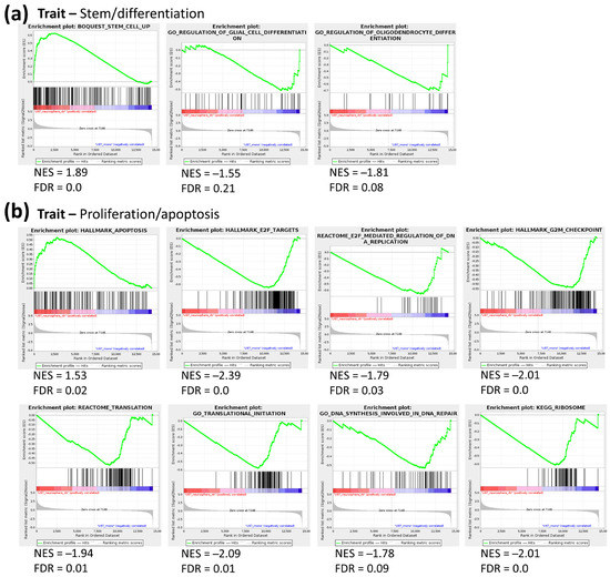 GSEA of gene sets associated with stem/differentiation and proliferation/apoptosis traits in NS vs. ML from NCH644 cells. (a) Several differentiation-associated gene sets are enriched in NS. (b) Gene sets associated with apoptosis and oxidative stress response are downregulated in NS; n = 3, FDR < 0.25.