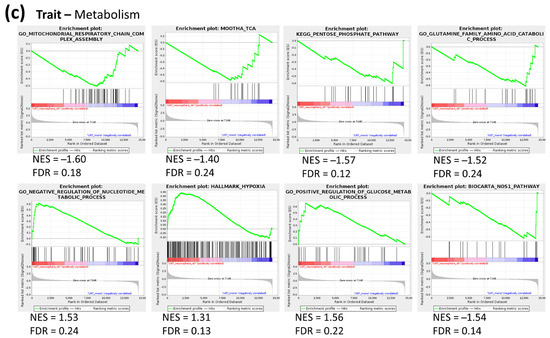 GSEA revealed 292 C2 gene sets, 143 C5 gene sets and 21 H gene sets that show significantly higher expression in U87 NS compared to ML (Table S1c). On the other hand, 238 C2 gene sets, 157 C5 gene sets and 4 H gene sets showed higher expression in ML compared to NS (Table S1c). Surprisingly, in NCH644 cells, GSEA showed no gene sets that were significantly induced in NS compared to ML, while 50 C2 gene sets, 142 C5 gene sets and 8 H gene sets were found to be upregulated in ML over NS (Table S1d). From these, gene sets assigned to general traits such as metabolism, proliferation/apoptosis and stem/differentiation processes were selected, and the respective enrichment plots are displayed (Figure 2 and Figure 3). In U87 cells, a previously defined stem cell signature showed clear enrichment in the NS condition, while ML cells presented an enrichment of glial cell and oligodendrocyte differentiation signatures (Figure 2a). This strongly suggests that NS culture conditions indeed induce a stem-like phenotype, while ML culture conditions maintain cells under a more differentiated state. Moreover, U87 NS cultures showed enrichment of an apoptosis gene signature, while several signatures associated with cell cycle, translation and DNA replication/repair were downregulated (Figure 2b), suggesting that U87 cells in NS culture have lower proliferative capacity than their ML counterparts. Gene sets representing metabolic pathways, including mitochondrial respiratory chain assembly, tricarboxylic acid (TCA) cycle, pentose phosphate pathway (PPP) and glutamine metabolism were down in U87 NS (Figure 2c), while a gene set representing negative regulation of nucleotide metabolism was upregulated (Figure 2c), supporting metabolic rewiring driven by altered gene expression. In contrast, two gene sets associated with hypoxia and regulation of glucose metabolism were upregulated in U87 NS (Figure 2c), and both processes have already been associated with stem-like features in GBM [11,12,13]. Additionally, a gene set associated with the nitric oxide pathway was downregulated in U87 NS, pointing at a possible regulation of nitric oxide synthesis in these cells (Figure 2c).
