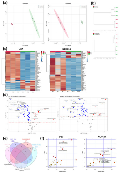 Metabolomics analysis of ML and NS from U87 and NCH644 cells. (a) Principal component analysis and (b) hierarchical clustering of all metabolites, showing a clear separation between ML and NS samples in both cell lines. (c) Heatmaps and (d) volcano plots of increased (red) and decreased (blue) metabolite levels in NS vs. ML from U87 and NCH644 cells (FDR < 0.05). (e) Venn diagram depicting the number of significantly increased (UP) and decreased (DN) metabolites in NS vs. ML, as well as commonly and differentially regulated metabolites between U87 and NCH644 cells (FDR < 0.05). (f) Metaboanalyst analysis of significantly regulated metabolites in NS vs. ML from U87 and NCH644 cells (FDR < 0.05, Pathway impact > 0.5); n = 3.