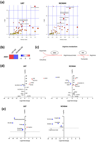 Joint pathway analysis of NS vs. ML reveals arginine biosynthesis as the most significantly regulated pathway. (a) Joint pathway analysis of significantly regulated metabolites (FDR < 0.05) and genes (FDR < 0.05, log2FC > ±1) in NS vs. ML from U87 and NCH644 cells. (b) ASS1 is significantly upregulated in U87 NS and downregulated in NCH644 NS, compared to ML cells (FDR < 0.05). (c) Schematic view of the arginine biosynthesis process. (d) Significantly upregulated (red) and downregulated (blue) genes involved in arginine metabolism, in NS vs. ML from U87 and NCH644 cells (FDR < 0.05). (e) Metabolites involved in arginine metabolism whose levels are significantly increased (red) and decreased (blue), in NS vs. ML from U87 and NCH644 cells (FDR < 0.05); n = 3. ADC—arginine decarboxylase; ARG—arginase; ASL—argininosuccinate lyase; ASS1—argininosuccinate synthase; CAD—carbamoyl-phosphate synthetase 2, aspartate transcarbamylase and dihydroorotase; CPS1—carbamoyl-phosphate synthase 1; GATM—Glycine Amidinotransferase; NAGS—N-acetylglutamate synthase; NOS1—nitric oxide synthase 1; OAT—ornithine aminotransferase; ODC1—ornithine decarboxylase 1; SLC1A3—solute carrier family 1 member 3; SLC25A13—solute carrier family 25 member 13; SLC25A15—solute carrier family 25 member 15.