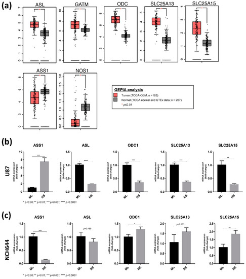 Expression analysis of arginine biosynthesis genes in NCH644 NS compared to ML cells may resemble human GBM tumours compared to normal tissue. (a) Expression data from human GBM tumours (TCGA-GBM; n = 163) and corresponding normal tissue (TCGA normal and GTEx data; n = 207) were accessed via the GEPIA tool (http://gepia.cancer-pku.cn/index.html, accessed on the 3 December 2020). Data were selected based on a log2-fold change cut-off of 1 and a p-value cut-off of 0.01. Only significantly altered genes are shown. (b) qPCR analysis of arginine biosynthesis genes in U87 ML and NS cultures. (c) qPCR analysis of arginine biosynthesis genes in NCH644 ML and NS cultures.