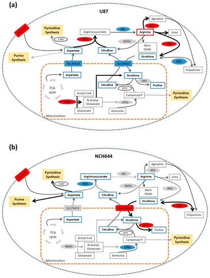 Proposed model of arginine metabolism in U87 and NCH644 neurospheres. (a) U87 NS present ASS1 upregulation, pointing towards aspartate shuttling into arginine synthesis. Arginine may then be used by ADC or ARG in the cytoplasm for agmatine and ornithine production, respectively. By upregulating NAGS, ornithine production may be further induced to maintain a high flux of arginine synthesis. Increased arginine synthesis and urea cycle metabolism in these cells may result in a reduction of nucleotide metabolism, by reducing the available aspartate pool and preventing purine and pyrimidine synthesis. (b) NCH644 NS, by downregulating ASS1, may shuttle aspartate away from arginine biosynthesis and towards nucleotide production. In addition, ornithine may be used by ODC in the cytoplasm for the production of polyamines or it can enter the mitochondria through the SLC25A15 transporter to be used by OAT for proline synthesis. Through ASS1-dependent metabolic rewiring, NCH644 cells could avoid feeding aspartate into the urea cycle and preserve the availability of this amino acid for purine and pyrimidine synthesis, thus supporting their growth. ADC—arginine decarboxylase; ARG—arginase; ASL—argininosuccinate lyase; ASS1—argininosuccinate synthase; CAD—carbamoyl-phosphate synthetase 2, aspartate transcarbamylase and dihydroorotase; CPS1—carbamoyl-phosphate synthase 1; NAGS—N-acetylglutamate synthase; NOS1—nitric oxide synthase 1; OAT—ornithine aminotransferase; ODC1—ornithine decarboxylase 1; SLC1A3—solute carrier family 1 member 3; SLC25A13—solute carrier family 25 member 13; SLC25A15—solute carrier family 25 member 15.