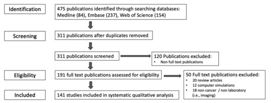 The systematic review was conducted using a number of search engines including “Medline“, “Embase“ and “Web of Science“ with the same initial search terms: “cancer“ and “hypoxia“, then narrowed down further using terms including “2D“ and “3D“ for all databases used. The databases above were all accessed on 28 May 2020. All publications in English language until 28 May 2020 were included for screening. Spelling variations and similar search terms were included for thorough inclusion of existing publications (Table 1).