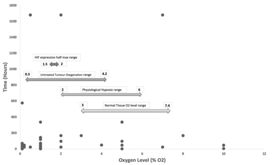 Hypoxia level vs Duration. 71% of studies explored oxygen levels of 1% or below and 71% of studies exposed in vitro cultures for 72 h or less. Arrows demonstrating oxygen range of normal tissue, physiological hypoxia, untreated tumours pathological hypoxia and HIF half maximum expression range. Several studies used oxygen levels outside of the range of physiological tissue hypoxia.