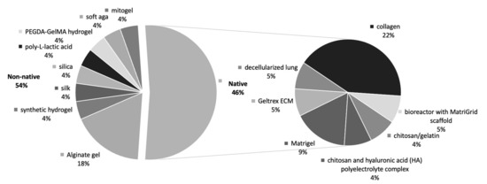We identified 42 publications from our cohort that specifically studied chemotherapy resistance in 3D cultures, and similar numbers of studies used in scaffold-based cultures and non-scaffold-based cultures (53% vs. 47%). On further investigation, the studies where scaffold-based 3D cultures were used, a much greater percentage of studies used native materials (72%) compared to non-native materials (28%). Similar to the cohort of studies concerning biomimicry of tumour culture, collagen and alginate appear to be the most frequently used materials for native and non-native scaffolds. This noteworthy finding could be due to native ECM proteins being deemed more biomimetic as a 3D scaffold, with materials such as collagen used extensively. Collagen type I is found in the dense fibrotic tissue and the tumour microenvironment, and by using this material, studies report the use of native materials to be more consistent between in vitro and in vivo findings (Figure 8).