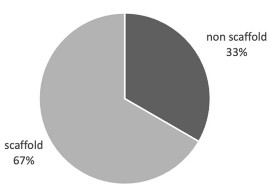 EMT studies: Scaffold vs. non scaffold. Proportional representation of scaffold and non-scaffold based studies exploring EMT, highlighting the importance of ECM in the process.