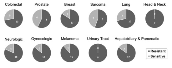 Cancer-specific response to chemotherapy. Each response represents a single experimental outcome. A larger fraction of all cell-lines showed resistance to chemotherapy. Cell-lines that were not frequently studied were categorized under an organ system. Sarcoma includes osteosarcoma, chondrosarcoma, and fibrosarcoma cell-lines. Head and neck cancers include head and neck squamous cell carcinoma, adenoid cystic carcinoma, and ameloblastoma cell-lines. Urinary tract cancers include renal cell carcinoma, renal cell carcinoma bone metastasis, and bladder cancer. Gynecologic malignancies include ovarian and cervical cancer cell-lines. Neurologic cancers include glioblastoma multiforme, neuroblastoma and astrocytoma cell-lines. Hepatobiliary and pancreatic cancers include hepatocellular, biliary tract, and pancreatic cancer cell-lines.