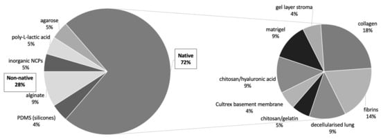 Drug resistance studies: scaffold types. Proportional representation of native and non-native scaffold types used in 3D in vitro tumour models in studies regarding drug resistance with preference towards native scaffold materials over non-native material choices.