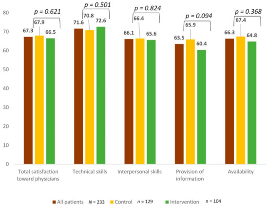 Figure 1 shows the average overall score of satisfaction with physicians and its 4 associated sub-scores. The average satisfaction score was 67.3 (SD: 20.4) for the full sample, with no difference between the two groups of patients (67.9 vs. 66.5, p = 0.621). Satisfaction with technical skills, interpersonal skills, information provision, and availability of physicians was similar between the two groups.