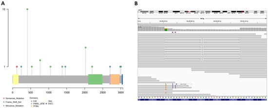 (A) Lollipop plot of the rare and predictively disruptive germline variants detected in the ATM gene. (B) Representation of a 28 bp frameshift deletion present in one patient.